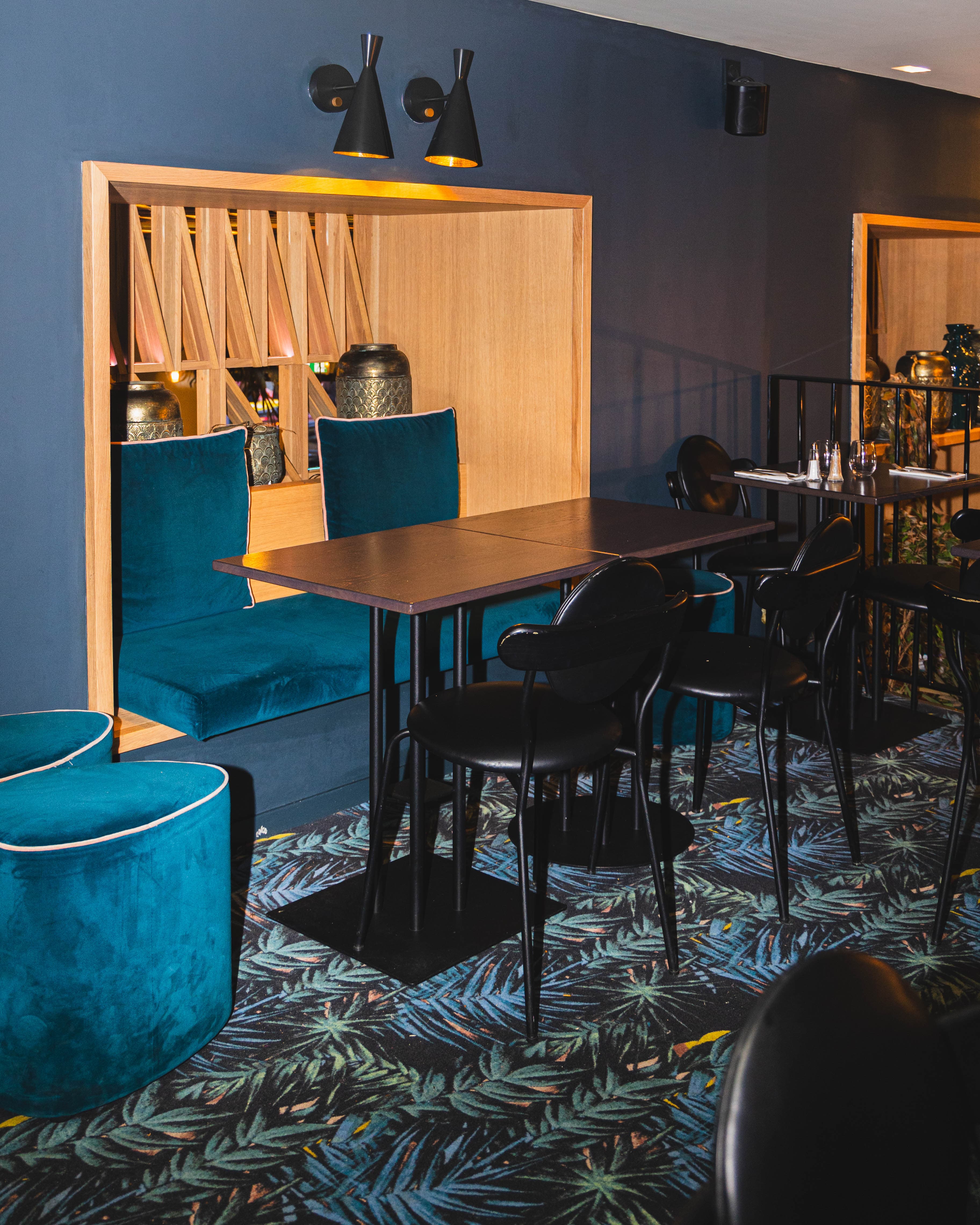 Décoration élégante : Fauteuils bleu chic et ambiance chaleureuse.